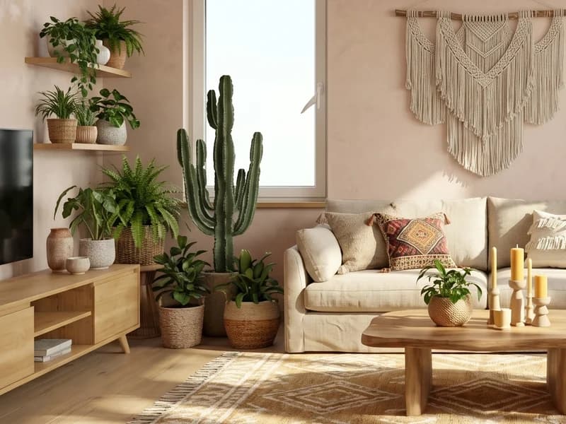 Terracotta tiles, Berber kilim, voluminous macramé and potted plants. Layered textures in ochre, rust and indigo for a free-spirited feel.