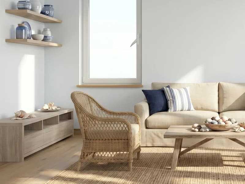 Whitewashed floors, natural wicker and navy-and-white striped cotton. Seaside palette: white, sky blue, linen, pebbles and sea-glass ceramics.