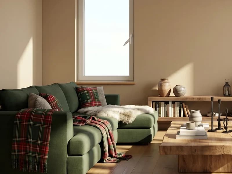 Warm brown oak floors, deep forest green and thick tartan textiles. Solid timber, faux fur throws and wrought-iron lanterns for a mountain feel.