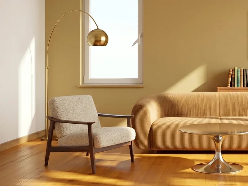 Tapered legs, organic silhouettes and satin brass accents. Mustard yellow, petrol blue and teak flooring for retro elegance.