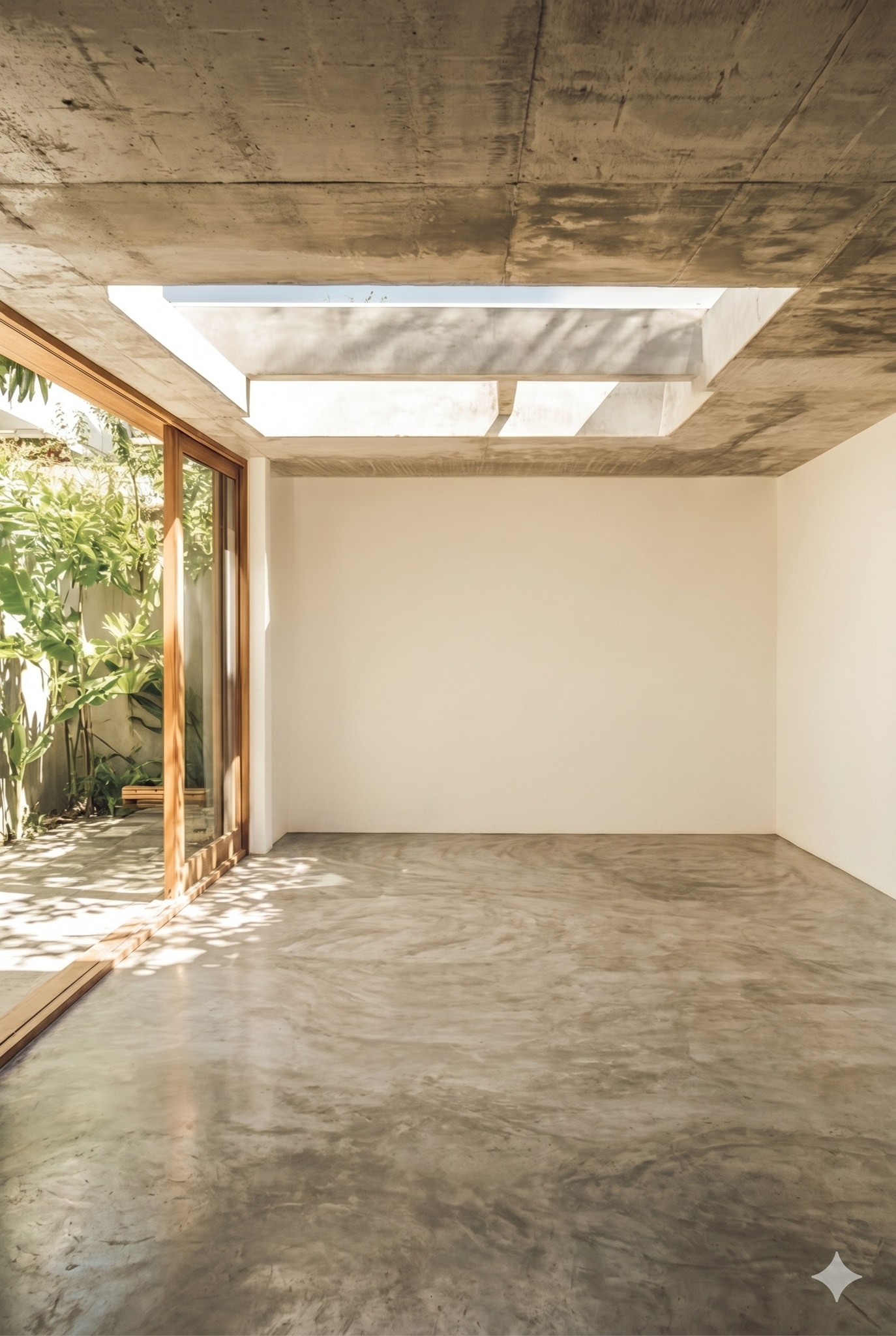 A single tone from floor to ceiling, pure-volume furniture with no ornament. Empty space and diffuse light as the only decorative elements.